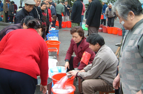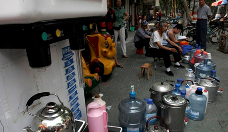 2007年5月30日,無錫市曹張新村,市民在一處凈水站排隊等待灌水。2007年5月29日晚,無錫市政府連續(xù)召開緊急會議,就市民關心的自來水水質問題進行研究,并連夜部署應急措施。各方監(jiān)測數據顯示:今年入夏以來,該市區(qū)域內的太湖水位出現50年以來最低水位,加上天氣連續(xù)高溫少雨,太湖水富營養(yǎng)化較重,諸多因素導致藍藻提前爆發(fā),形成自然災害,一定程度上影響了自來水水源地水質