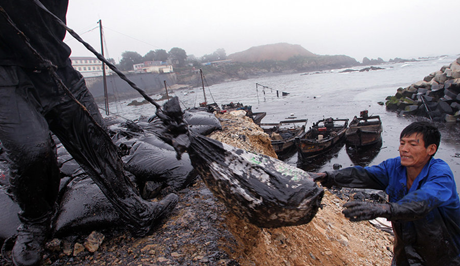 2010年7月21日,大連新港南海碼頭,漁民在清理油污。7月16日,大連新港輸油管道發(fā)生起火爆炸,事故造成大量原油泄漏海上。