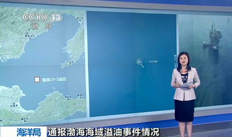 截屏圖:2011年7月5日,國家海洋局通報蓬萊19-3油田溢油事故。央視關注渤海漏油事件,并用放大鏡暗諷中海油數據。