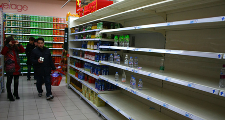 2014年5月18日中午,浙江富陽,記者來到當地的沃爾瑪超市,大批市民涌入超市急購瓶裝飲用水,大批貨柜上的礦泉水被搶購一空。富陽市人民政府今日發(fā)布通告,稱7時接杭州市環(huán)保局和桐廬縣環(huán)保局通報,桐廬縣發(fā)生運輸車側翻泄漏事故,部分四氯乙烷泄漏至富春江。富陽市政府決定,富春江沿線各取水單位暫停從富春江取水,從12時起暫停自來水供應。
