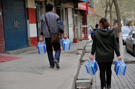 2014年4月11日蘭州自來水苯超標事件,甘肅蘭州市,街頭隨處可見市民大批量整箱購買瓶裝水。