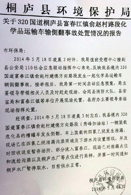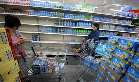 2014年5月18日中午,浙江富陽,記者來到當地的沃爾瑪超市,大批市民涌入超市急購瓶裝飲用水,大批貨柜上的礦泉水被搶購一空。富陽市人民政府18日發(fā)布通告,稱7時接杭州市環(huán)保局和桐廬縣環(huán)保局通報,桐廬縣發(fā)生運輸車側翻泄漏事故,部分四氯乙烷泄漏至富春江。富陽市政府決定,富春江沿線各取水單位暫停從富春江取水,從12時起暫停自來水供應。